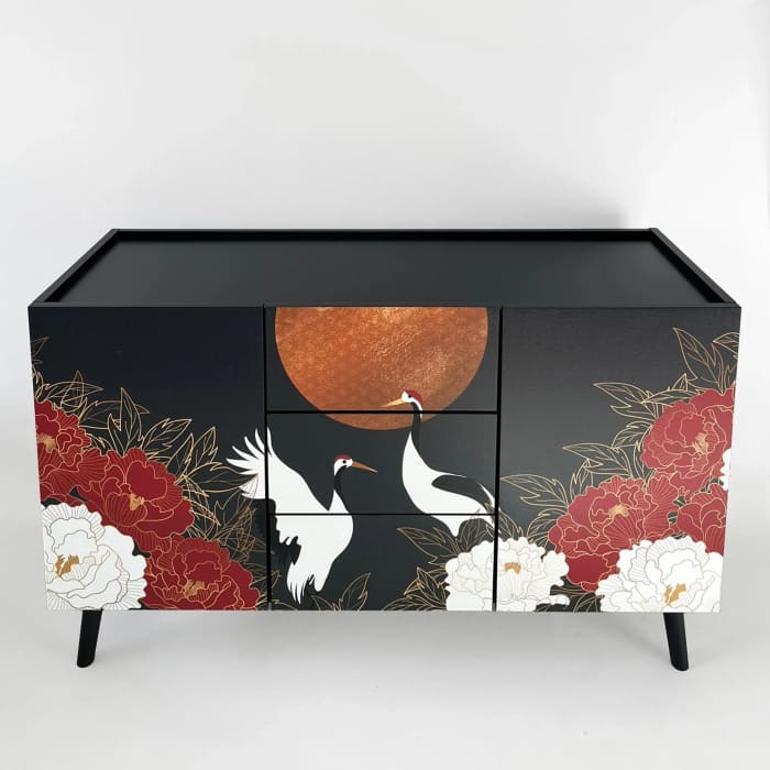 Bring artistry, cultural symbolism, and sustainable design into your home with this original Oriental Style Sideboard, beautifully upcycled by Dresser and Drawer, an independent UK Furniture Artist. Featuring delicate Japanese-inspired artwork with cranes, red and white peonies, and a burnished copper sun, this piece represents balance, longevity, and prosperity—perfect for homes that appreciate statement furniture with character.