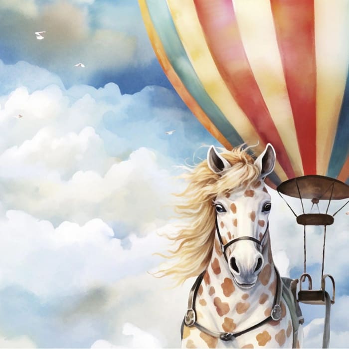 Let your imagination take flight with the High in the Sky A1 Decoupage Paper by Three Yellow Goats. This whimsical design features a piebald horse gracefully pulling a seat suspended beneath a hot air balloon drifting through soft clouds, capturing the magic of dreamlike adventure and gentle fantasy. Perfect for transforming furniture, wall panels, or creative art pieces with a touch of surreal charm.