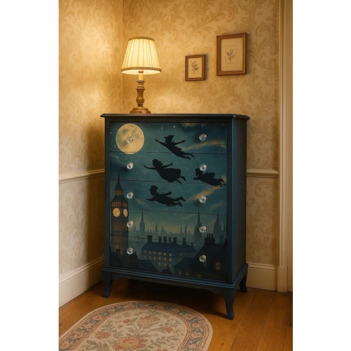 Bring a touch of storybook wonder to your creative world with the Peter Pan A1 Decoupage Paper by Three Yellow Goats. This enchanting design captures Peter Pan, Wendy, John, and Michael soaring through the starlit London night sky, surrounded by twinkling lights and the magic of Neverland. Ideal for creating dreamy statement pieces, whimsical wall art, or nostalgic décor inspired by beloved childhood tales.