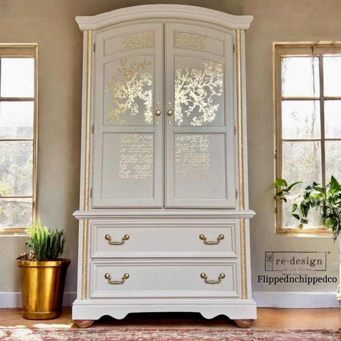 Add a touch of luxury to your home with Redesign With Prima Églantine Elegance Décor Transfer by Kacha. Featuring grand golden florals and radiant foil motifs, this 18” × 24” sheet (cut into 2 sheets) is perfect for furniture, mirrors, decorative panels, and bespoke décor projects.