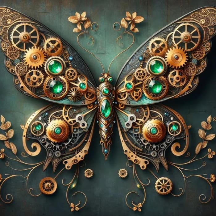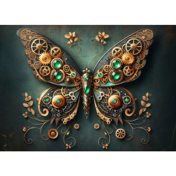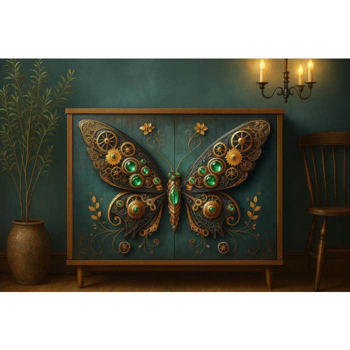 Bring industrial elegance and whimsical fantasy to your creative world with the Steampunk Butterfly A1 Decoupage Paper by Three Yellow Goats. This captivating design features an exquisitely detailed mechanical butterfly, adorned with shimmering green jewel accents, intricate gears, watch parts, and Victorian-era metal textures. The perfect fusion of nature and machinery, it’s ideal for bold furniture transformations, dramatic wall art, and unique mixed-media projects.